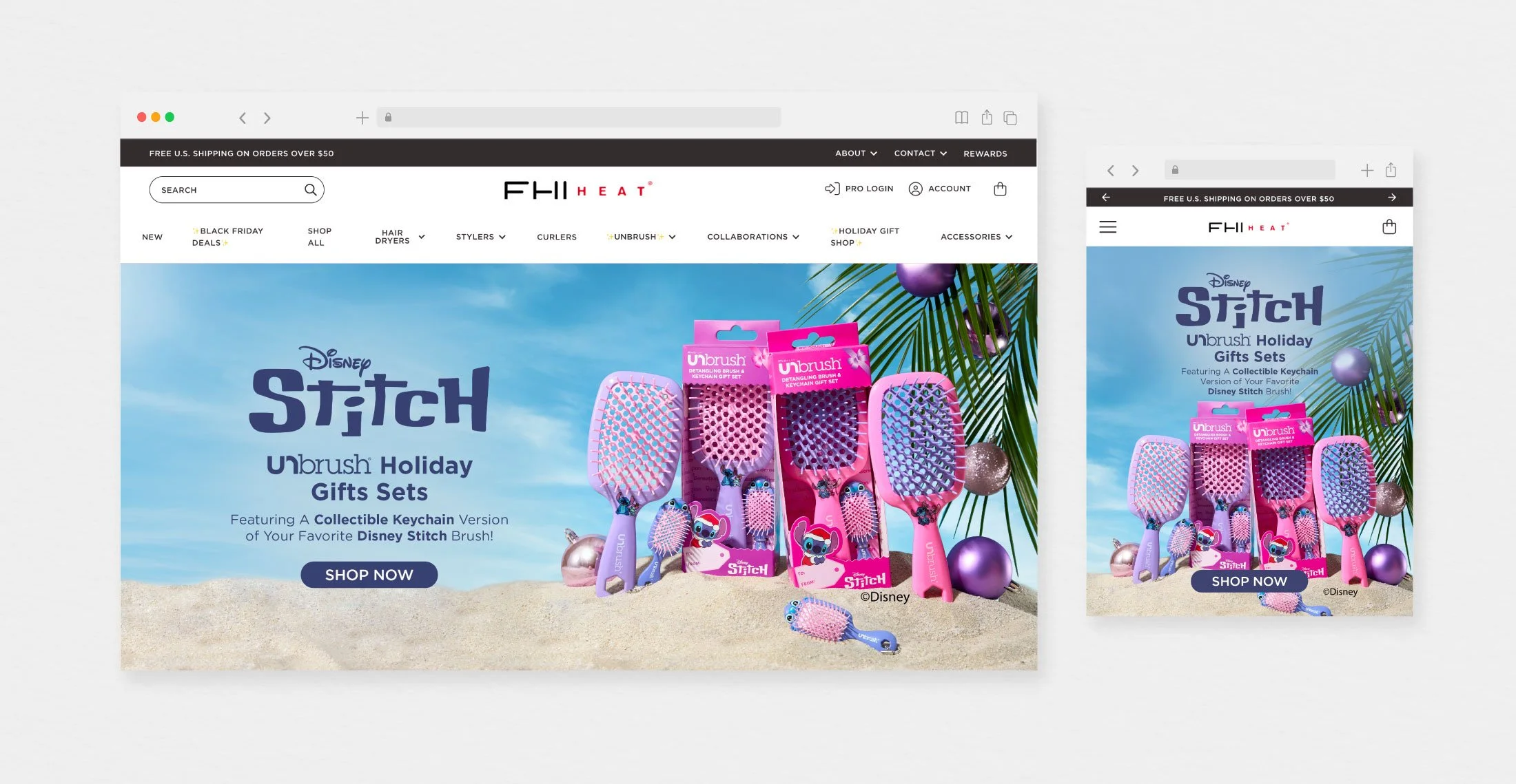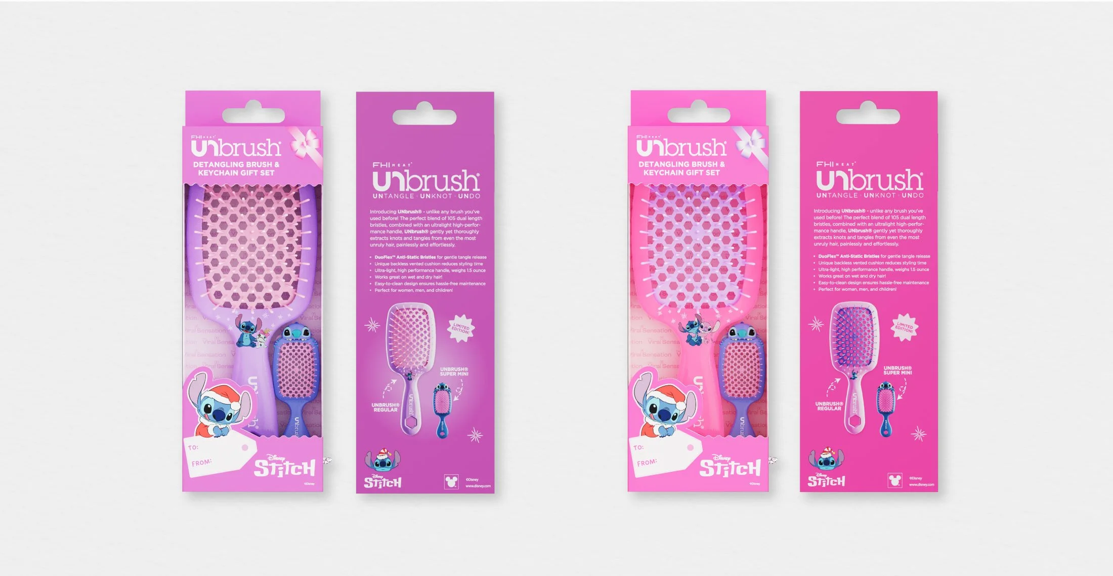 The UNbrush® is a viral detangling brush created by FHI Heat. Introducing the Disney Stitch UNbrush® Holiday Gift Sets. During this project, I worked on developing the product and packaging design as well as assisting in the creation of digital web assets across various platforms—including Instagram, Amazon, and TikTok.